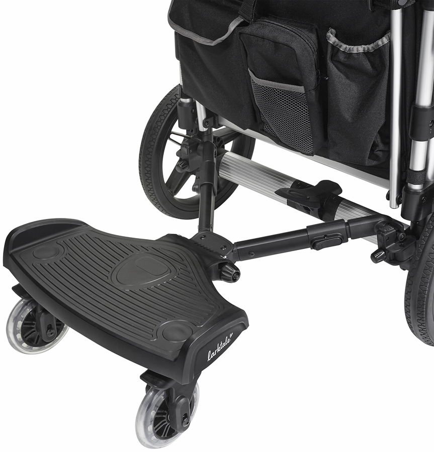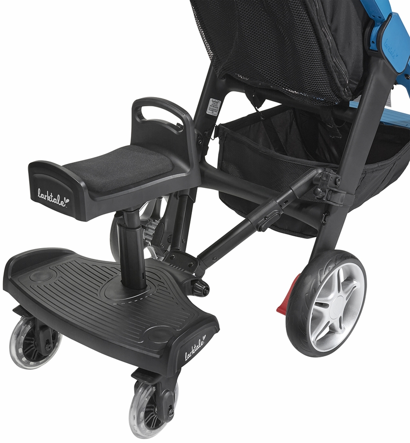 The Larktale Ride-Along Stroller Board attaches to the rear of nearly all strollers or stroller/wagons and provides a safe and comfortable spot for your tired toddler to ride along. This 2-in-1 design provides a comfortable saddle seat for your youngsters to lounge on, or the saddle seat can be removed to provide a sturdy platform for your older toddler to hop on and off of.