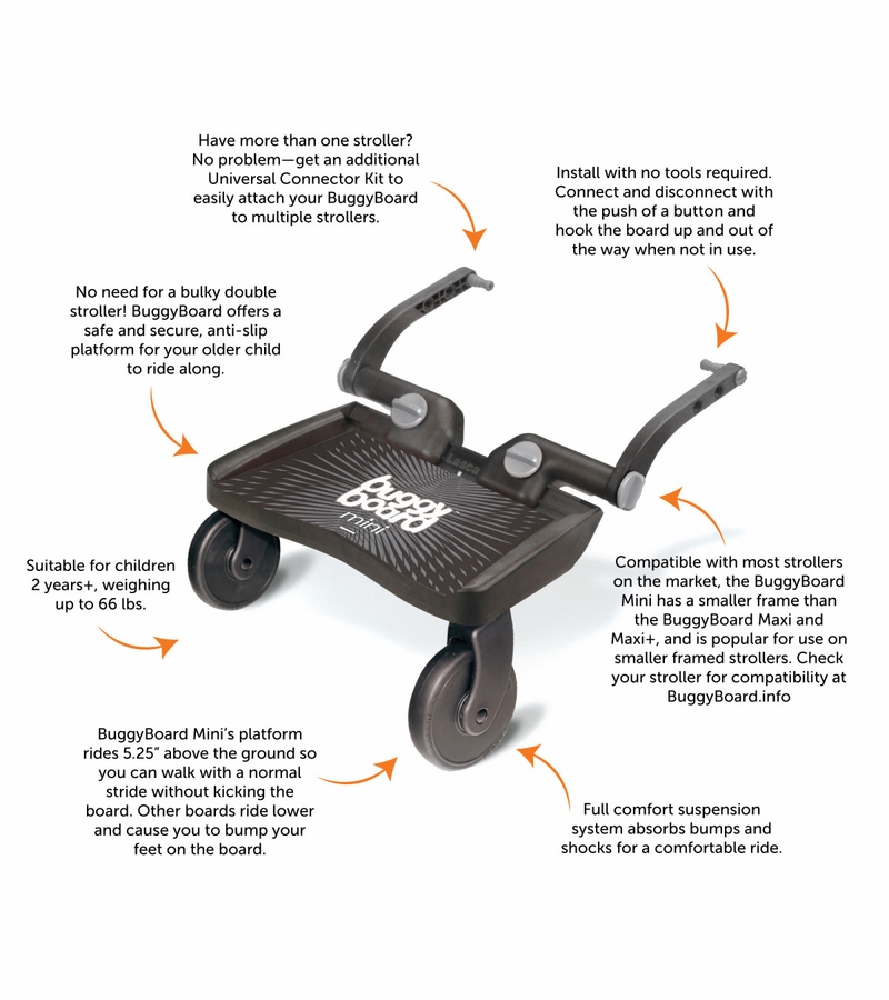 The BuggyBoard® Mini is compact, lightweight and comfortable. Ideal for your umbrella stroller, this board gives your child a smooth, safe ride, and full manoeuvrability for you.