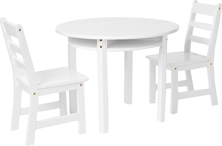 Perfect for coloring pictures of dinosaurs or practicing the ABCs, this petite table and chair set from Lipper International makes a great addition to any kid's room. For children up to age 12, the set comprises of a round table and two chairs. The table not only provides ample surface space, but it also contains a shelf for stowing scissors, crayons, and artworks-in-progress. With a 100-pound weight capacity each, the chairs' 13-inch seat heights enable children to sit down and get up with ease.