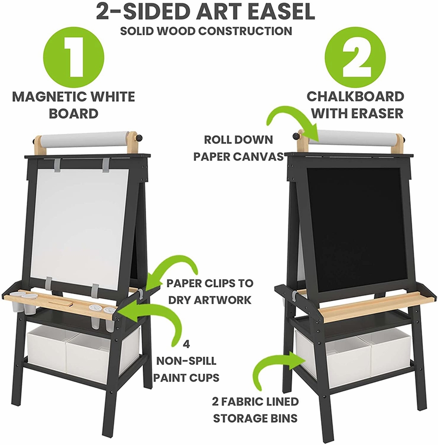 The Deluxe Learn & Play Art Center Easel features a chalk board, magnetic dry erase board, and parchment paper feeder, allowing your little creator to express the brilliant artist inside. A sturdy A-frame construction made of layered pine will last your little artist through the years. Two wide shelves with two fabric, folding storage bins will keep art supplies easily accessible and organized. Craft paper clips are within easy reach to expand your little one’s options for drawing and painting or giving finished artwork a safe place to dry. One roll of parchment paper, four non-spill paint cups, and an eraser are also included.