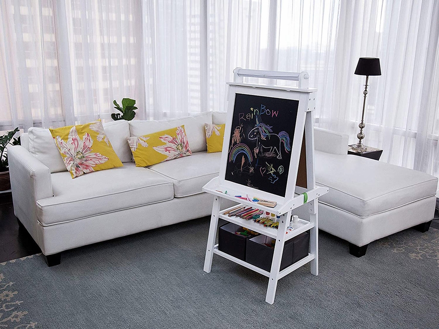 The Deluxe Learn & Play Art Center Easel features a chalk board, magnetic dry erase board, and parchment paper feeder, allowing your little creator to express the brilliant artist inside. A sturdy A-frame construction made of layered pine will last your little artist through the years. Two wide shelves with two fabric, folding storage bins will keep art supplies easily accessible and organized. Craft paper clips are within easy reach to expand your little one’s options for drawing and painting or giving finished artwork a safe place to dry. One roll of parchment paper, four non-spill paint cups, and an eraser are also included.