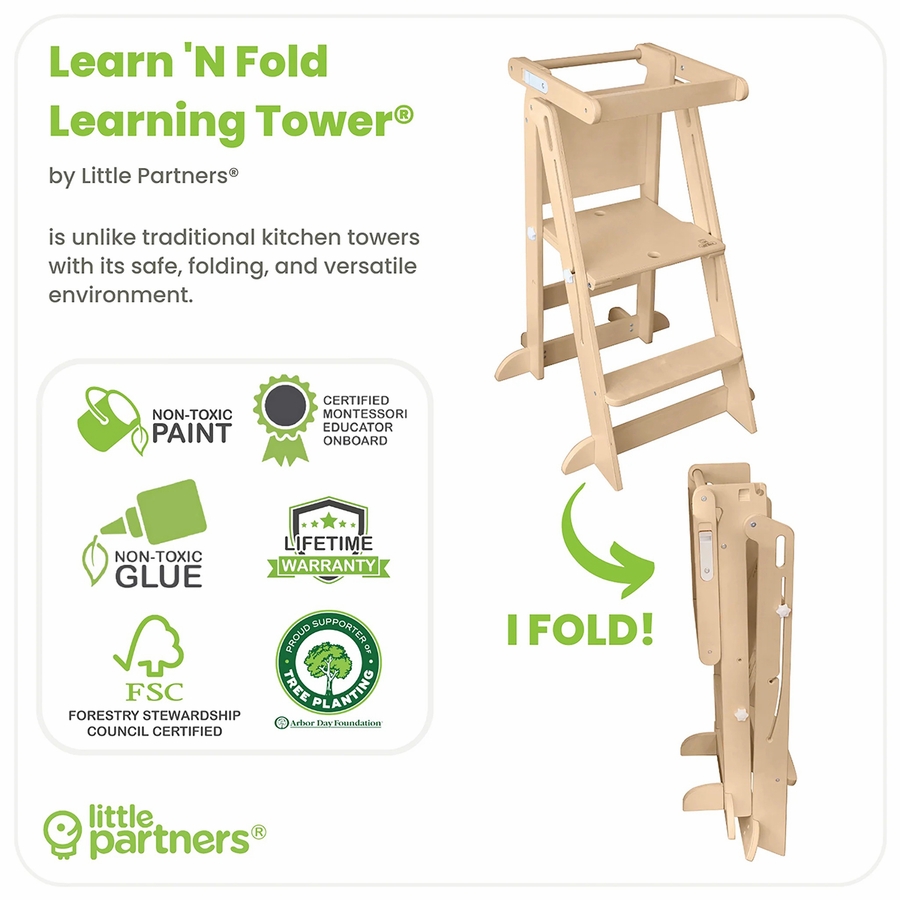 - Unlike traditional step stools that can be bulky and unsafe for young users, the Learn ‘N Fold™ Learning Tower® by Little Partners® provides a safe environment for your little one as well as a compact design that stores easily in your home when not in use.