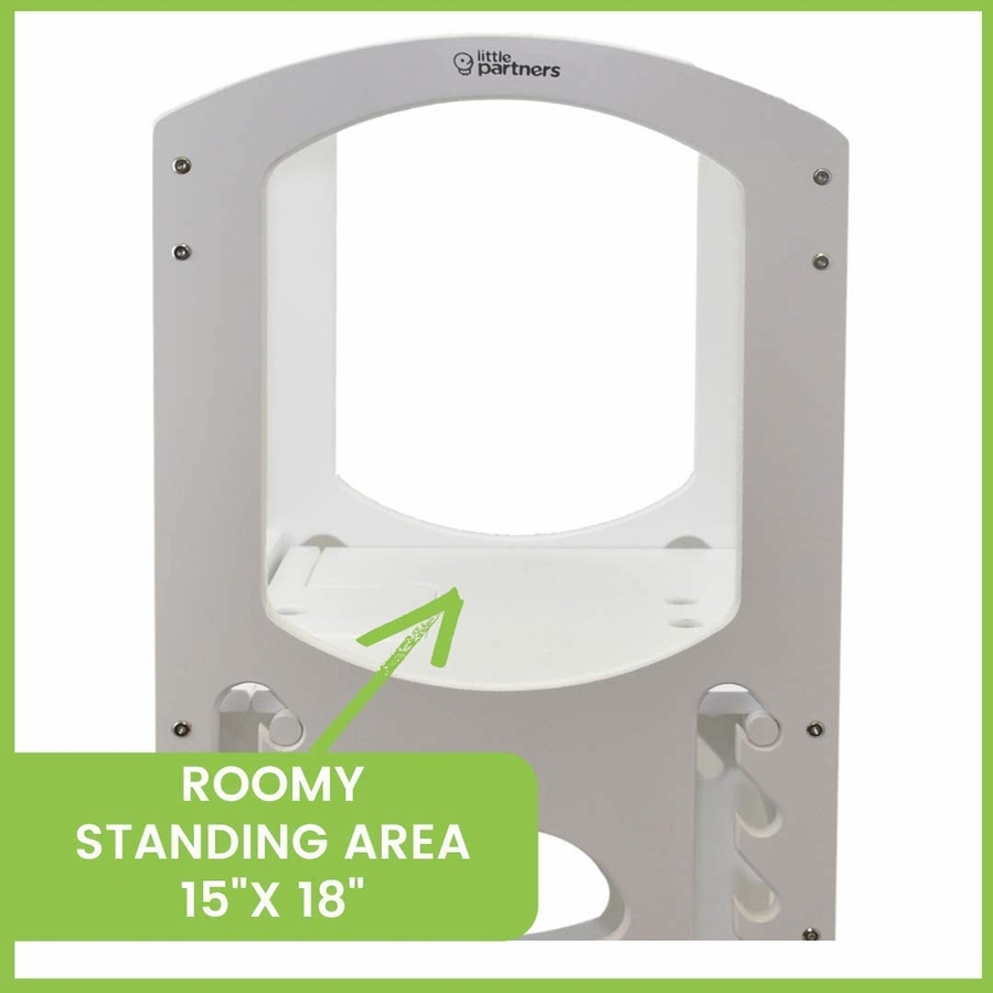 We love our learning tower! It takes up a LOT of space, so make sure this will fit in your kitchen. I’ve definitely tripped over the feet a few times. The tower feels much safer than what we had before and it is the perfect height for my son. He is two and acts a little afraid when he is on it sometime (he will only stand on the edges). We put the textured footprints down when we first got it and he disliked those so we removed them. I think he is still uneasy about the middle because of those. He has fallen out of the sides twice. He sat down once and went right through the open side one time and another time he misstepped and fell through the side. So you definitely need to watch kids closely. I wish there was an optional safety net or bar. I wanted to share some of the concerns, but it is super sturdy and really nicely made. It looks really good in our kitchen and it cleans up well outside with a hose and rag.