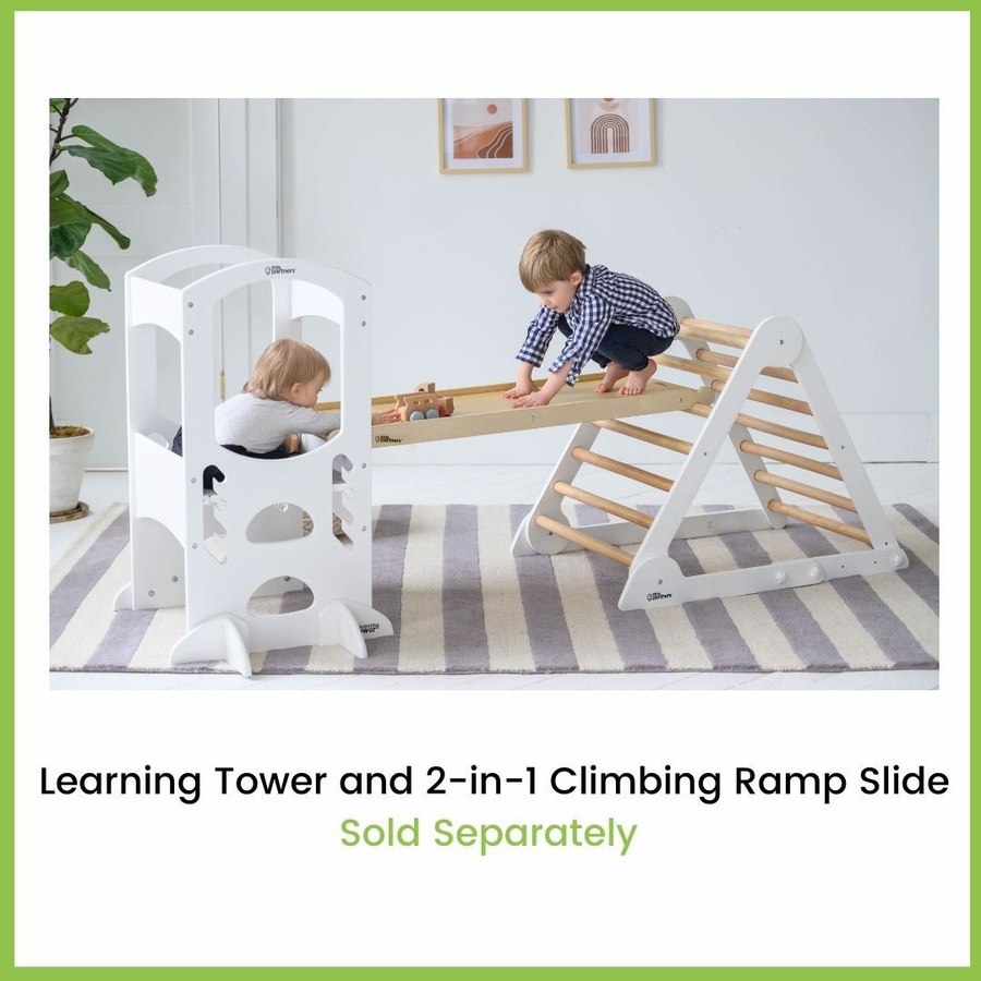 ENDLESS COMBINATIONS OF PLAY — Add to the adventure when you combine the Pikler Climbing Triangle with the Little Partners® 2-in-1 Climbing Ramp-Slide. Or double the fun with two Piklers connected by a Ramp-Slide—it’s a bridge between castles!