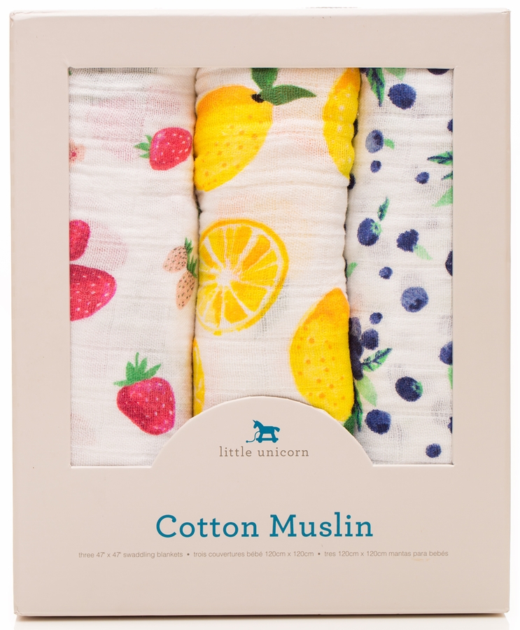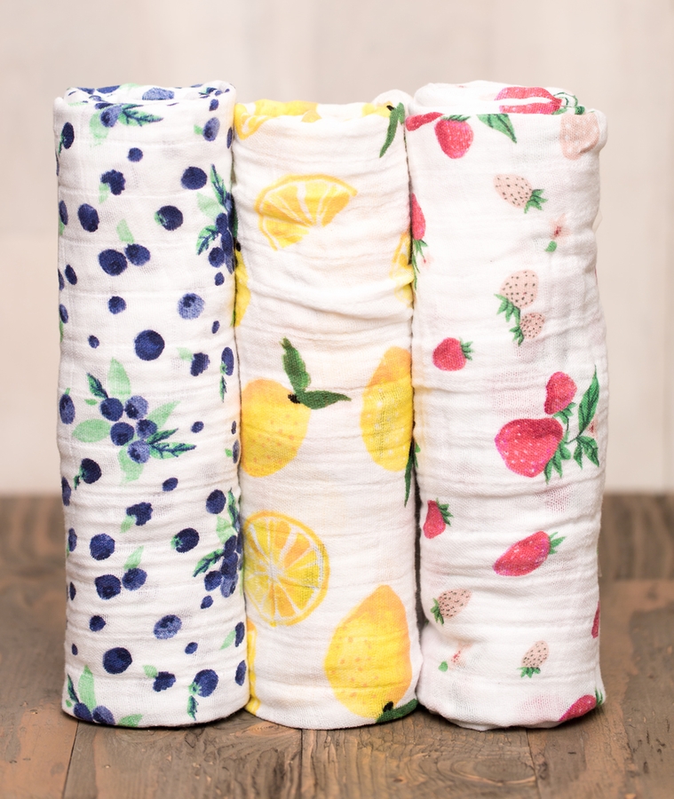 - Set includes Strawberry swaddle, Lemon swaddle, and Blueberry swaddle