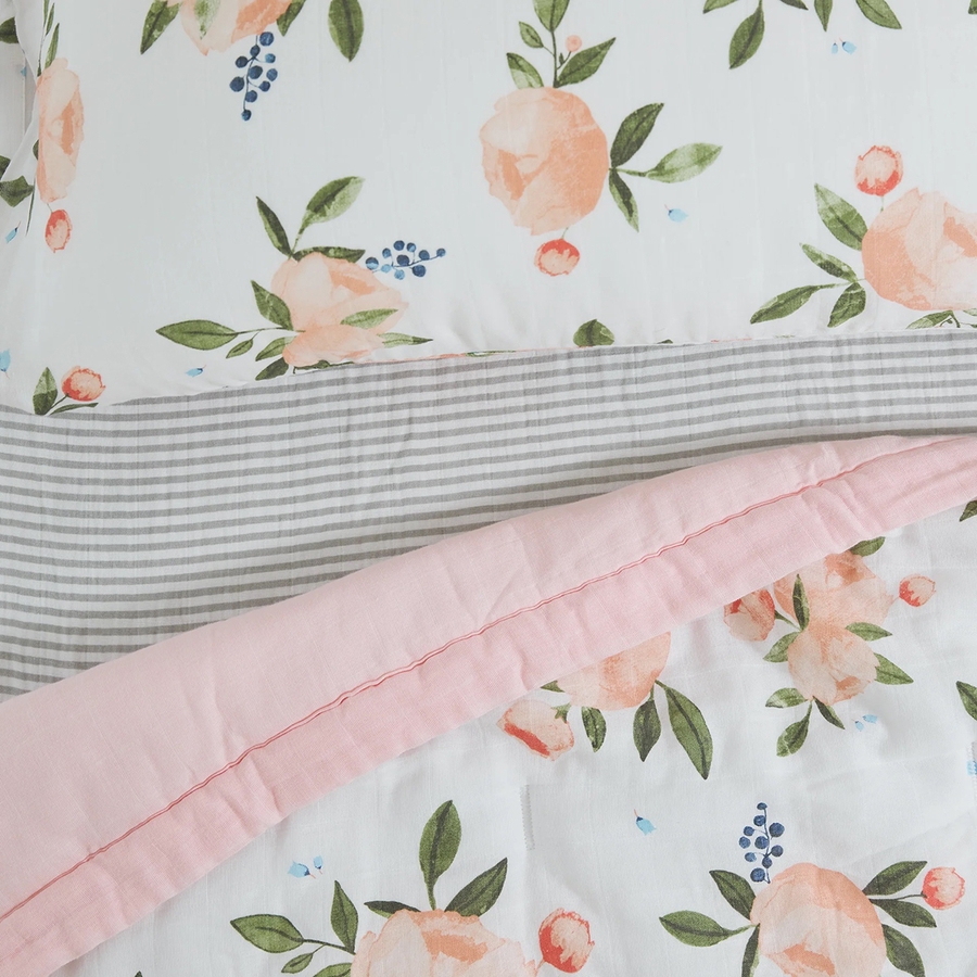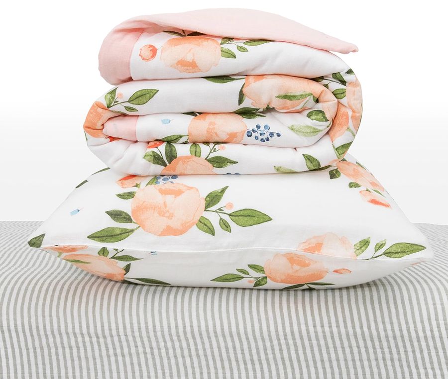 3 piece set includes: 1 Toddler Comforter, 1 crib sheet, 1 pillowcase.
