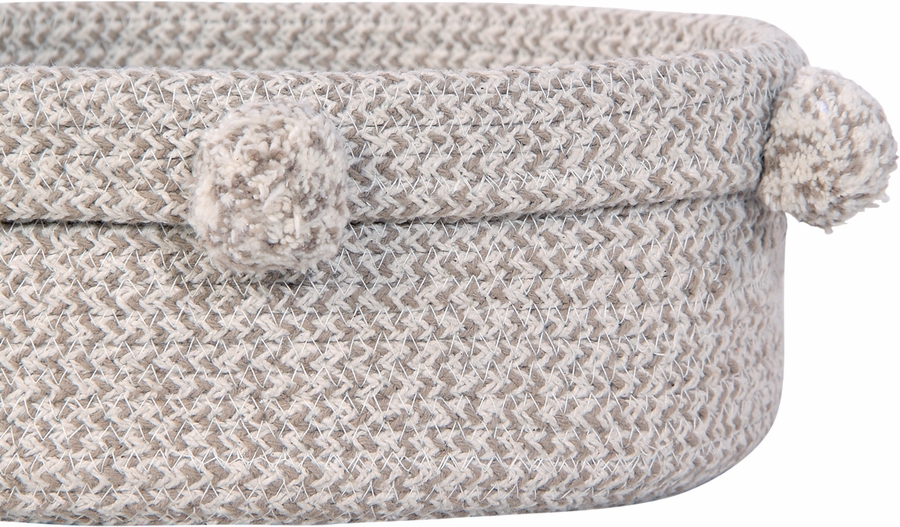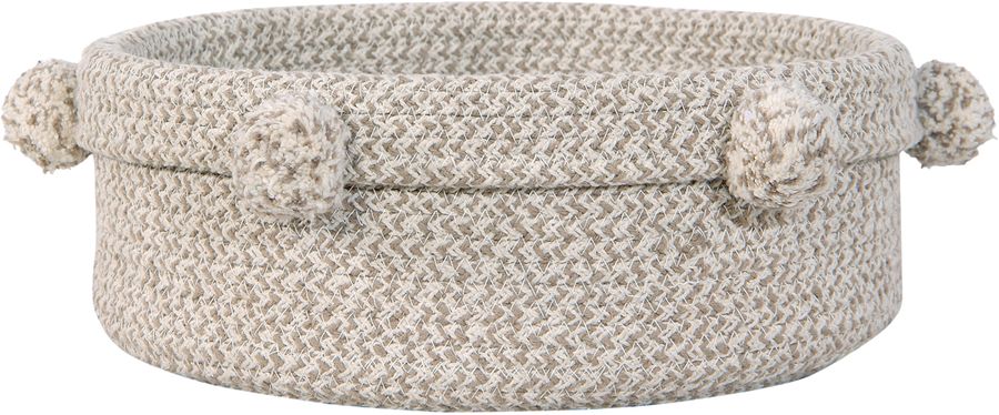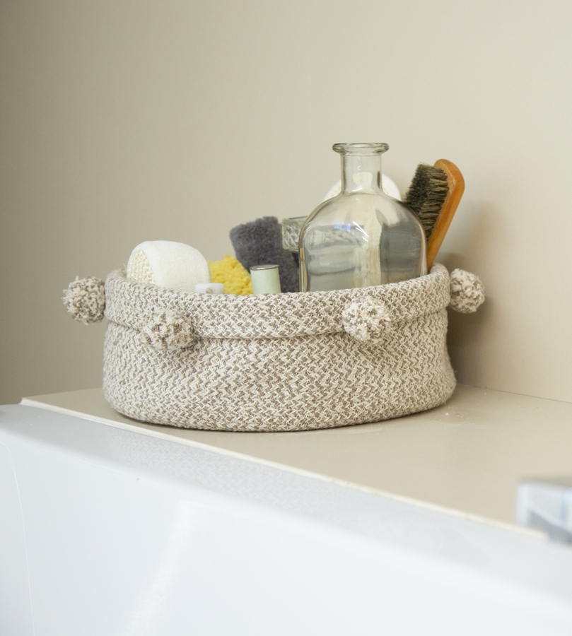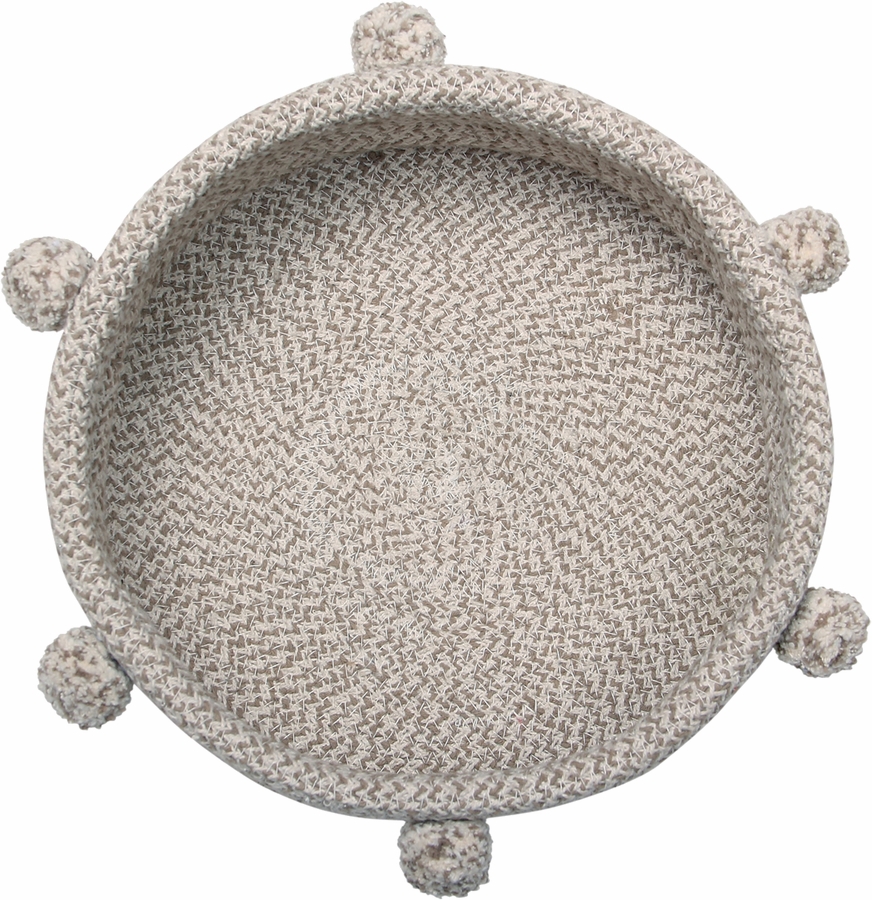 New sewing techniques have been used to create this new braided cotton basket. Made from mixed Natural and Light Brown yarn, it has cotton balls stitched to the exterior. We can consider this basket as a deco home accessory and as a storage complement. Also, it has an extra function because this basket could be used as a tray. We can say that this decorative basket is a must for interior design and home decor. SIZE: 5" x 1'