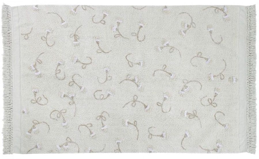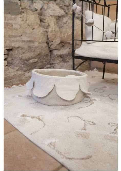 Lorena Canals wanted to rekindle her passion for nature with this washable rug in Ivory color with all over flowers. Being a handmade rug, every woven flower has been carefully perfected with scissor. The mixture of shapes and colors, such as white, ivory, natural and lined, brings harmony and finesse to home decor. As a novelty, a new type of elaborate fringe has been added to the floral rug, knotted one by one by hand.
