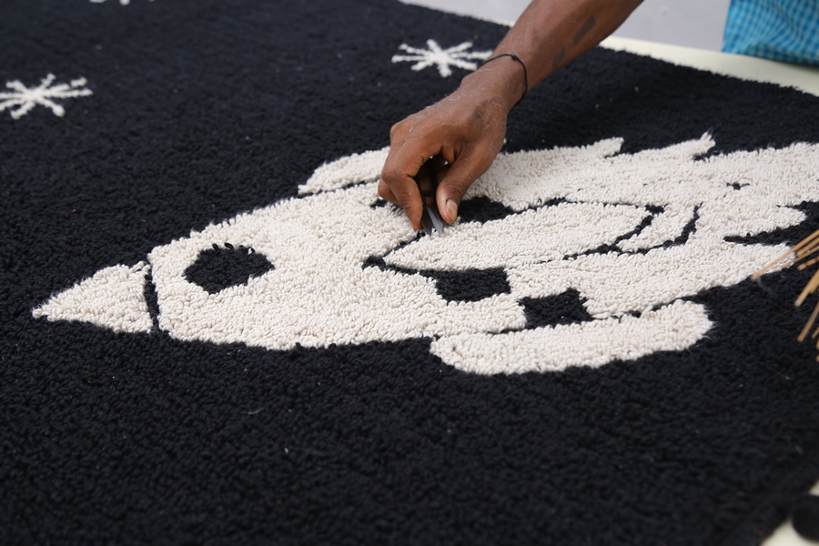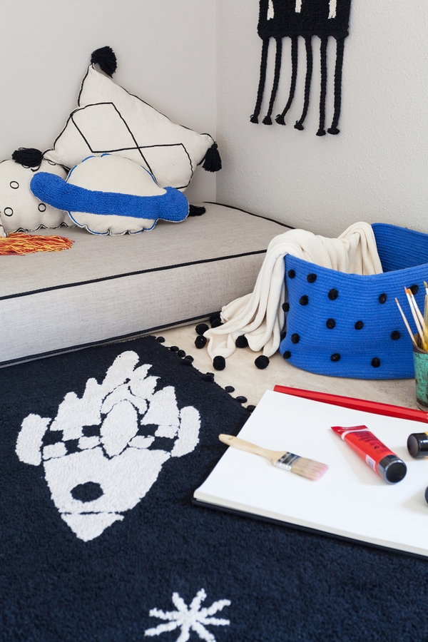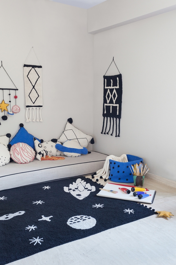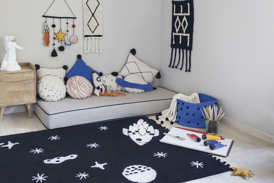 The Galaxy collection debuts as one of the great inspirations of the season - taking us as far as the moon and stars! The Universe rug is 100% cotton and washable in a domestic washing machine (weight: 9 kg). Rectangular in design, planets, stars, meteorites and rocket are depicted on a black background, all in the color of the natural cotton. It is the first Lorena Canals children's collection in black and natural colors, a trend that suits the decoration of children's bedrooms, whether girl's or boy's, and also living rooms, dining rooms and bedrooms. Hand-made by craftspeople, only natural dyes are used, making them completely safe and, being made of cotton, it is light, soft and pliable.