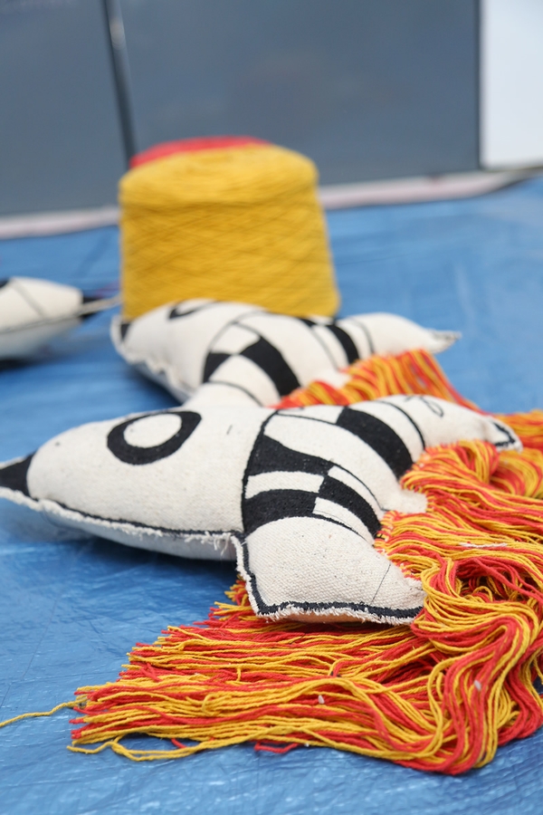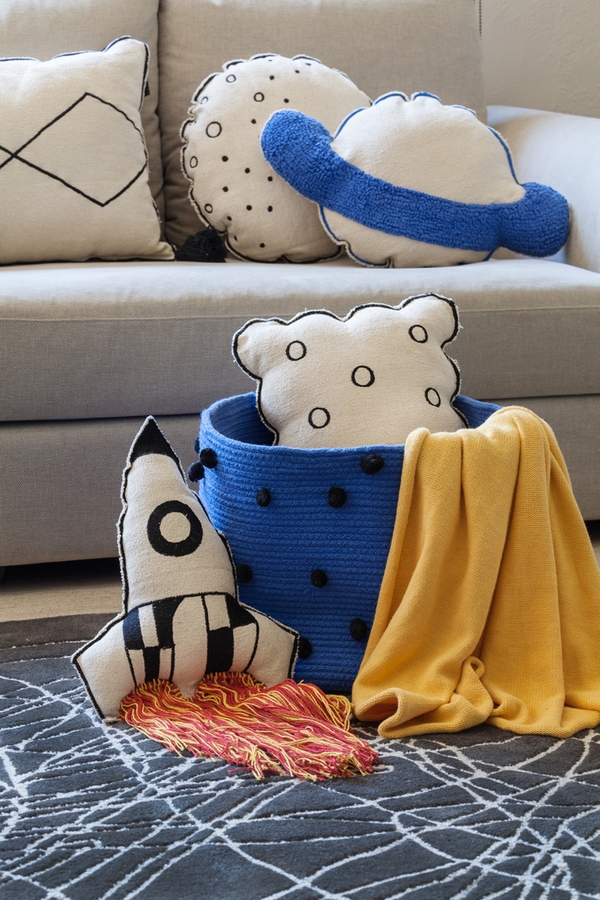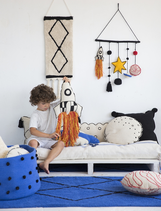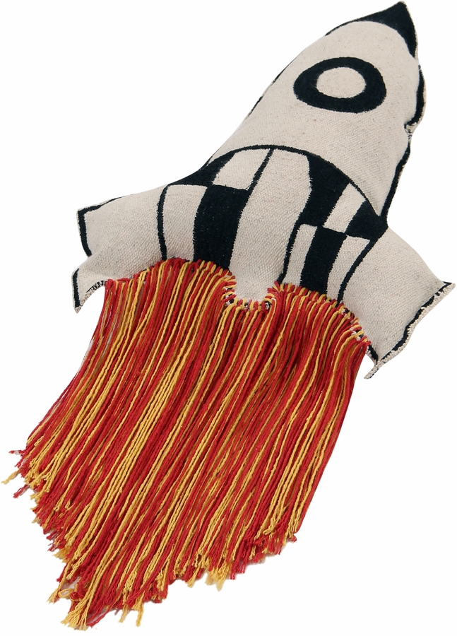 For traveling to infinity and beyond! The Rocket cushion, part of the Galaxy collection, takes the shape of a rocket with its vapor trail; the exterior is compact 100% cotton fabric, the stuffing is 100% polyester and the trail is strands of cotton in red and yellow. This cushion is fun for young and old alike, perfect for the children's room and also for the living room, couch, armchair, hammock, floor, bedrooms, etc. Machine washable without uncovering and, not having zippers or buttons, it is child-friendly. Combines perfectly with all of the Galaxy collection of cushions, Milky Way and Universe washable rugs and the Galaxy wall hanging.