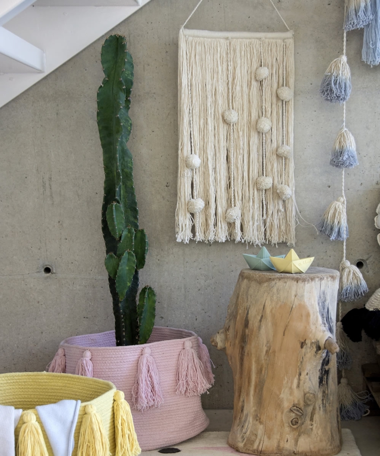 Cotton garlands are perfect for decorating any part of the home: living room, corridors, entrance hall, children's bedrooms, garden, patio, etc. The Pom Pom garland consists of a cord made of natural cotton (1.7 m) with eight pom poms 13 cm in length, each sewn to the cord. The pom poms are dyed with the Tie-Dye craft technique, stemming from the 1960s and the hippy aesthetic, each pom pom being submerged individually, dying them in fresh, cheerful and vibrant hues, and also in more vintage and subtle tones, always with a Tie-Dye effect. This is the first time Lorena Canals has created cotton garlands to decorate walls, ceilings, columns, beams, etc.
