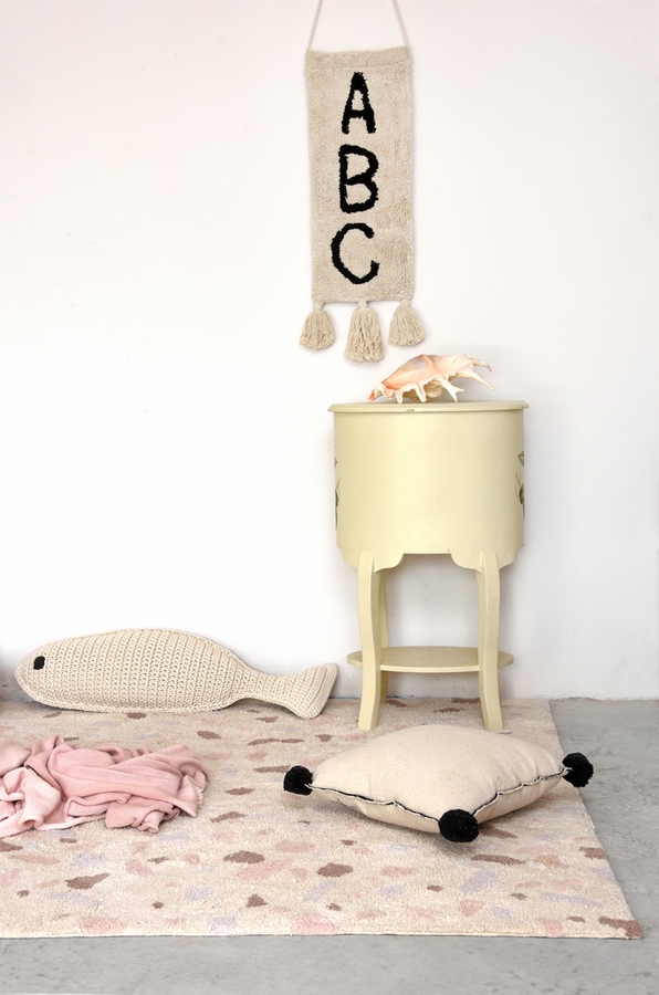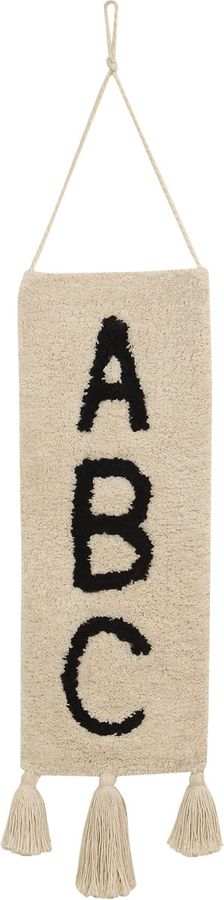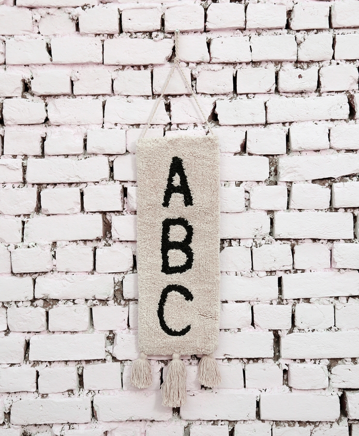 The ABC wall hanging reflects the new trend in wall decoration and is ideal for adorning the walls of living rooms, corridors, entrance halls, children's rooms, bedrooms, etc. The main color is that of undyed natural cotton and black (natural dye), providing a natural elegance that blends into any style, contemporary or classic. Wall hanging made from 100% natural cotton, created with the same technique as our rugs and finished off with three pom poms. It is hung with a cord joined to a plastic pole concealed in the upper part of the hanging. It combines perfectly with the Round ABC rug, Circle, Black or Arrow cushions and the Natural Black basket and blanket.