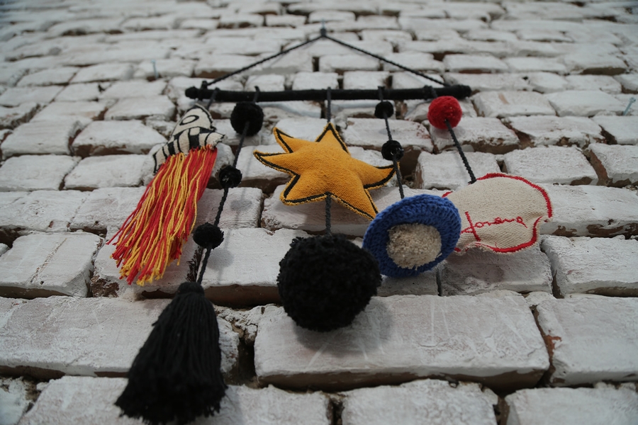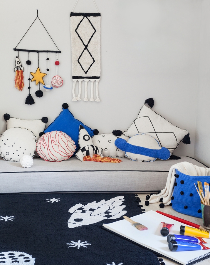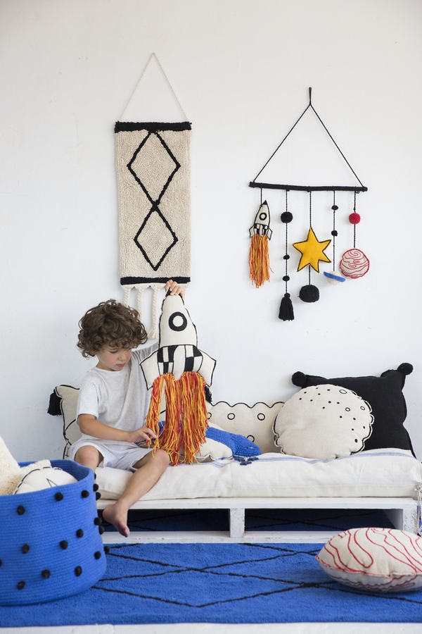 Outer space is infinite? like the imagination! The Galaxy wall hanging follows the trajectory of the space theme, and is ideal for the walls of living rooms, bedrooms, corridors and children's rooms. Hanging from five cotton cords, joined to a plastic pole covered in cotton thread, are small cushions (a star, Mars, Saturn, a rocket) and several balls and tassels. The various elements provide the color on a black background. The cushions have 100% cotton exteriors and 100% polyester stuffing, hand-made by craftspeople. This mobile-type wall hanging combines with Milky Way and Universe rugs, with Mars, Moon, Saturn and Rocket cushions and with Pebbles baskets.