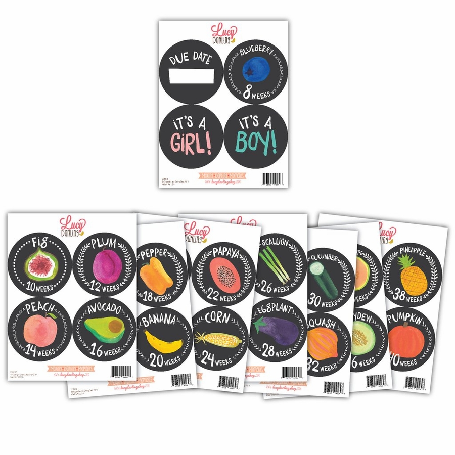 Every week sticker includes a fruit or vegetable chosen to fit the size milestone of your little baby!
