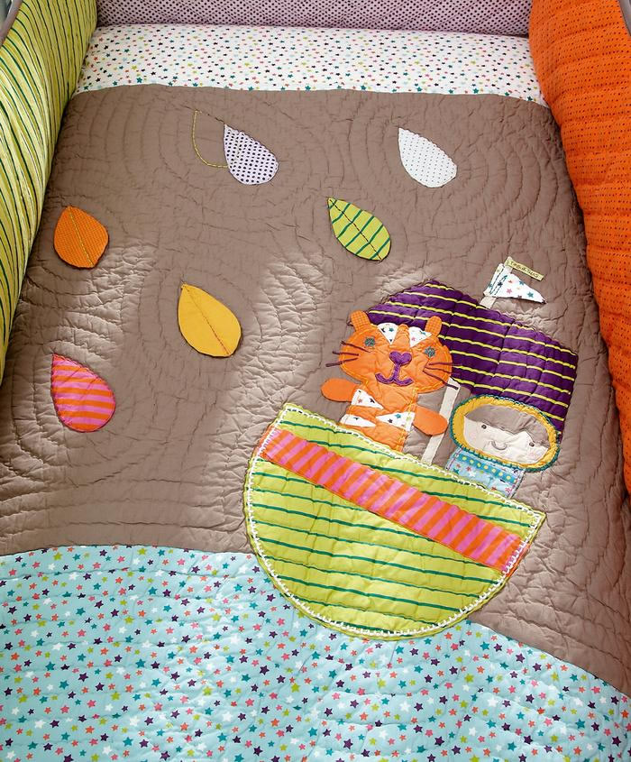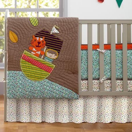 Designed to coordinate with the Timbuktales nursery d?cor collection this gorgeous bedding set includes a crib quilt, fitted crib sheet, crib skirt and window valance. Great for boys or girls this contemporary design provides a cozy sleep space for baby.