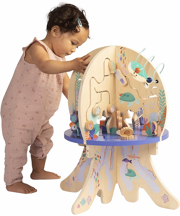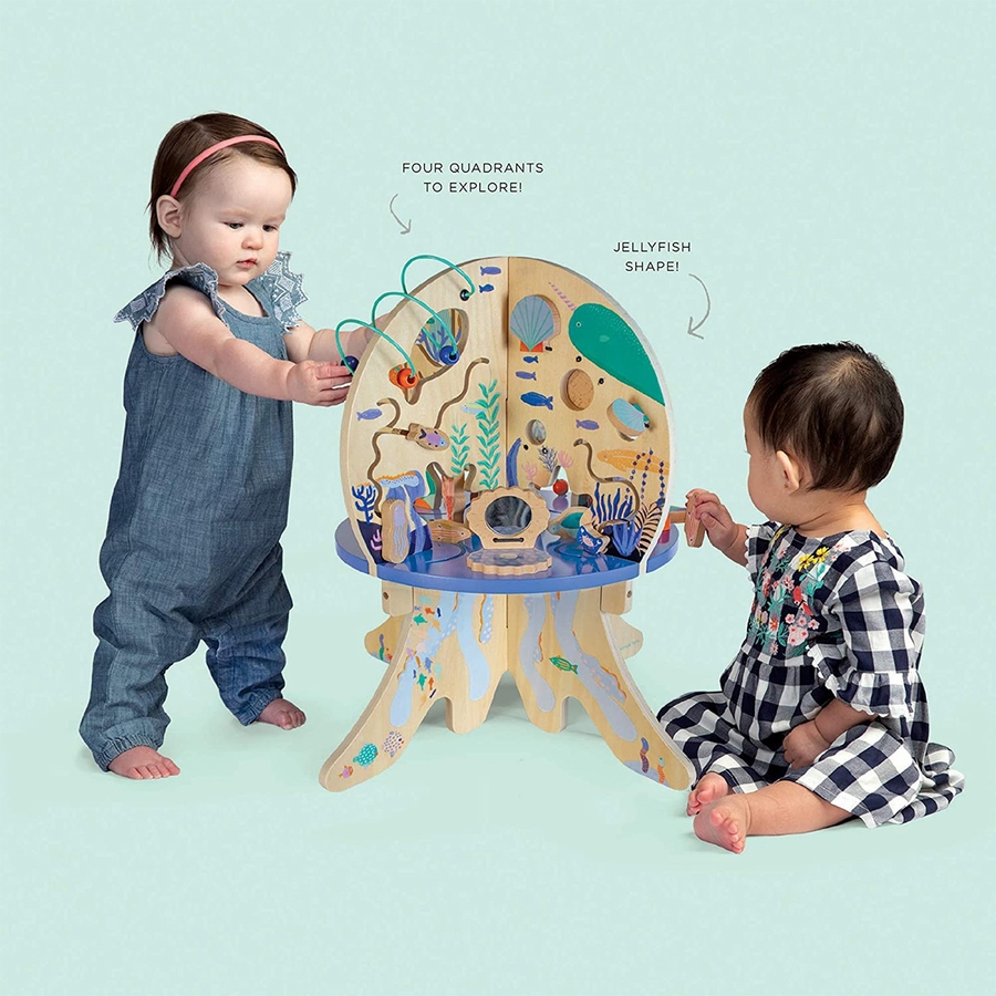 This wood activity center is packed full of exciting features! Includes 4 quadrants in the shape of a jellyfish with a variety of activities for baby: gliders, bead runs, spinning gears, springy coral and clacking clams.