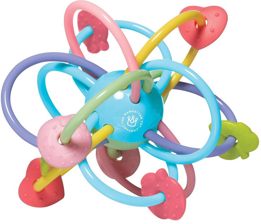 The Manhattan Ball is a rattle and teether for your young teething baby. Its maze of soft, continuous tubes and its stunning colors instantly capture and hold baby's attention. The mesmerizing loop design and lightweight construction make it very easy for little hands to grab, hold and rattle. A perfect clutching toy to engage baby's gross motor skills! The center ball features a quiet rattle so baby can explore sound and cause and effect. The soft, pliable loops are BPA-free for teething or gumming babies. Manhattan Ball can also be refrigerated to provide a more soothing experience for particularly sore baby gums and teeth. Colorful shapes are attached to the teething tubes for extra functionality, allowing baby to move them around and teethe on the textured surface of the shapes.