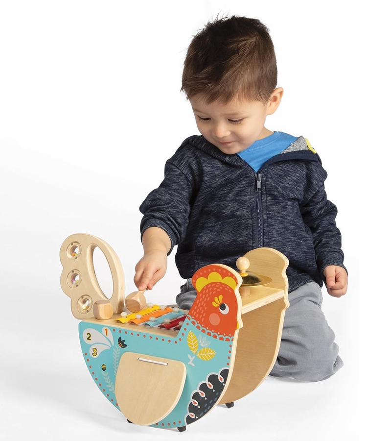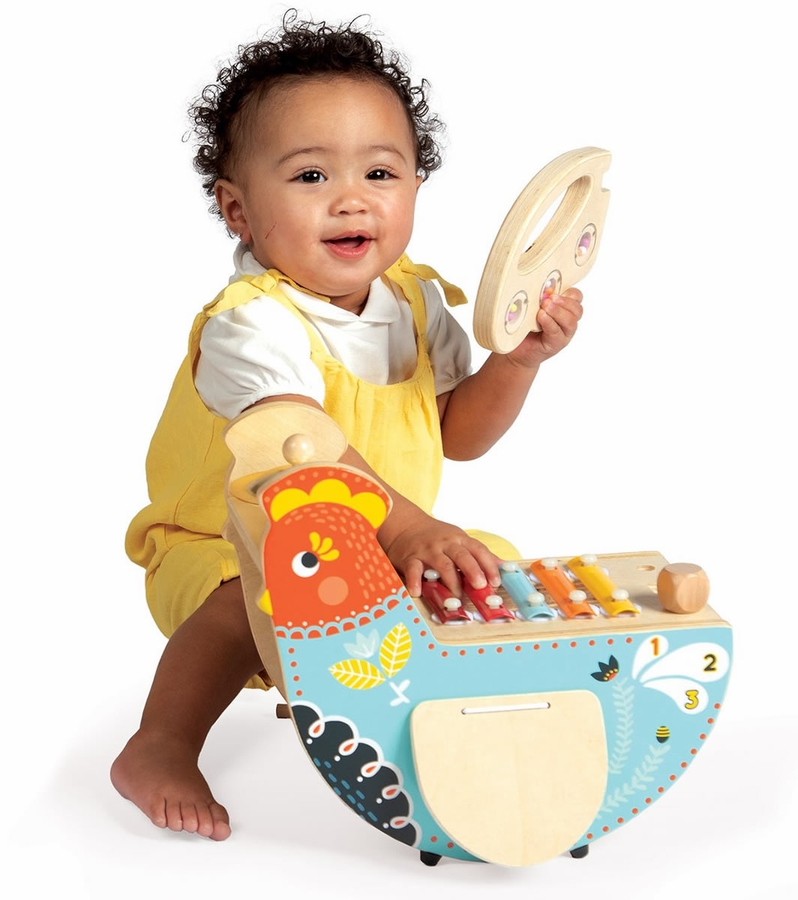 - The musical chicken is well built, sturdy, very attractive and cute. Baby liked it right away. Chicken has four stable "feet" but is able to rock forward and backwards, which gives the baby more positions to "play" it. Is an attractive and efficient wooden toy. I suspect this chicken will provide baby with happy times for years to come. Was able to purchase on sale from Albee, and its is totally worth the $40.