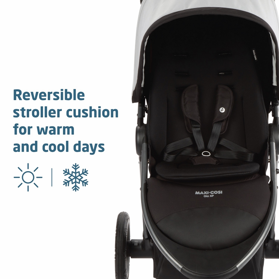 When you get the urge to explore with your little one, the Gia XP Luxe 3-wheel travel system will help get you where you’re going with ease. Designed to provide a smooth, comfy ride and maneuver easily with the all-terrain tires and front-wheel suspension, this stroller and car seat duo offers the features parents wish for and then some. The Mico Luxe Infant Car Seat provides safety for your baby with Side Impact Protection (SIP), while the infant head insert gives extra support for smaller babies. Premium PureCosi™ fabrics and padding keep your little one comfy, yet can be removed quickly with no rethreading of the harness when it’s time to machine wash and dry them. As you stroll, keep your child cozy with the removable, reversible, and washable stroller cushion designed to help baby stay cool on warm days and and warm on cool ones. Shelter your favorite travel companion from the sun by extending the MaxShade canopy with its zip-out peek-a-boo mesh window that allows added ventilation.