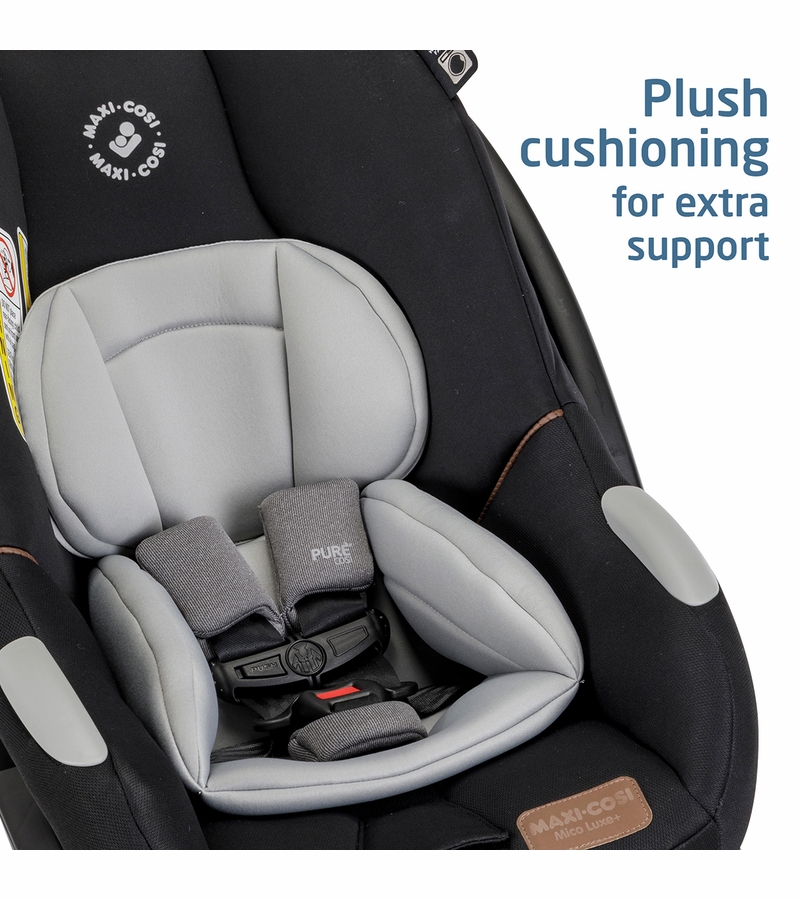 Designed for comfort and convenience, the lightweight Mico Luxe+ Infant Car Seat allows you to travel with ease. Swiftly move from car to car or a compatible stroller without stress or struggle. The intuitive base installation, featuring MaxiLock™ technology, allows you to achieve a secure fit in your car with its 3-position adjustable base, self-tightening LATCH system, and the load leg that limits movement in the event of a collision. Taxi-mode is simple and convenient with the large, visible belt guides that indicate how to position the belt without using the base. We factor your baby’s safety and comfort as key, which is why the shell is designed with ClimaFlow™ technology for added ventilation to help keep your baby cooler. Side impact protection and extra plush padding on the removable infant head and lumbar inserts are incorporated to ensure every child has a secure and cozy ride. Plus, you’ll enjoy added style and a more comfortable carrying experience with the vegan leather-trimmed, ergonomic handle contoured to curve around your hip.