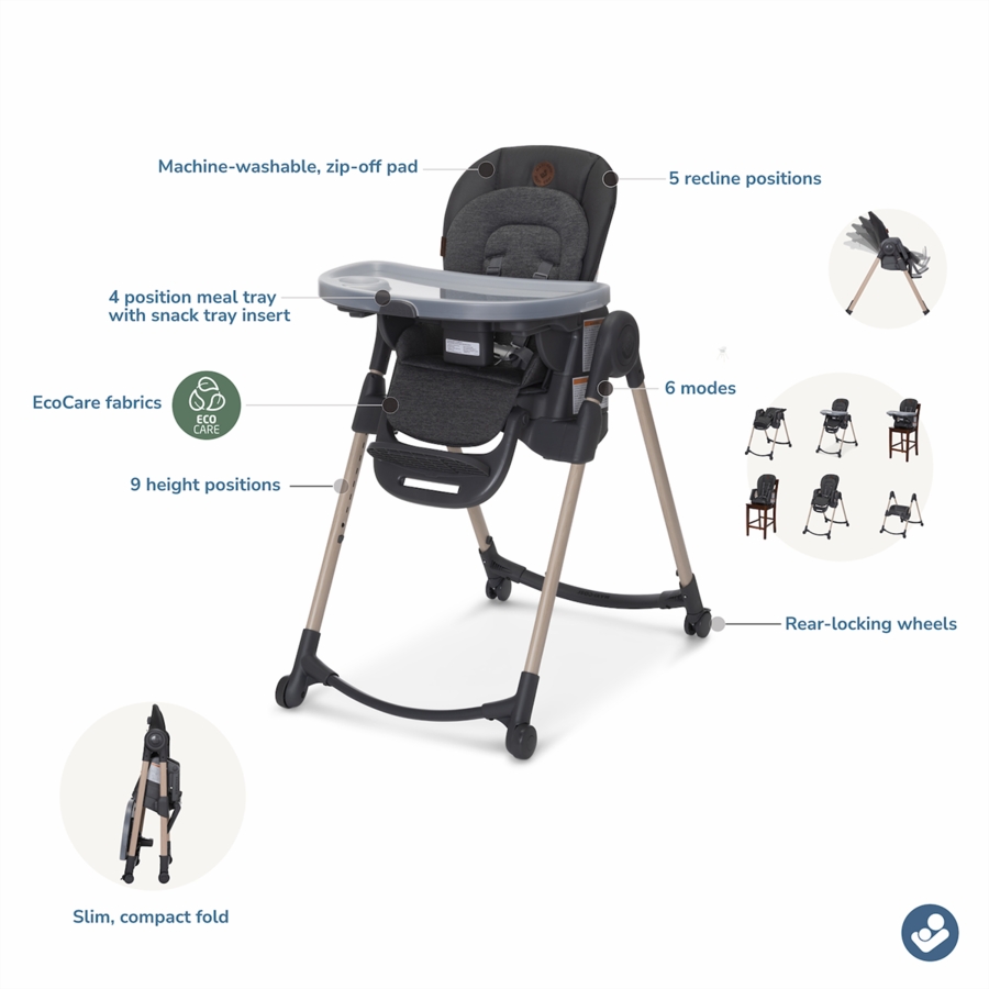 The Minla is full of possibilities. With its five recline positions, four tray positions and eight heights, you can use it as a relaxed infant seat thanks to the cozy inlay, as a high chair, as a cool booster seat with tray... The possibilities to have your child right there with you at the table are endless. A customized fit as your child grows? You got it with the 6-in-1 Minla high chair. While we cannot we cannot guarantee less of a mess from the birthday cake or vegetable puree, we can guarantee less trouble in cleaning it all up! The high quality materials and zip-off seat pad are easy to wipe down or throw in the laundry. The Minla is almost too good-looking to stow away - but sometimes you just need the space. When finished with your meal or planning a party, you can easily store away the Minla thanks to its compact folding ability. But the Minla is so stylish, you may just want to leave it out as a conversation starter! The Maxi-Cosi Minla. The high chair that changes as much as they do.