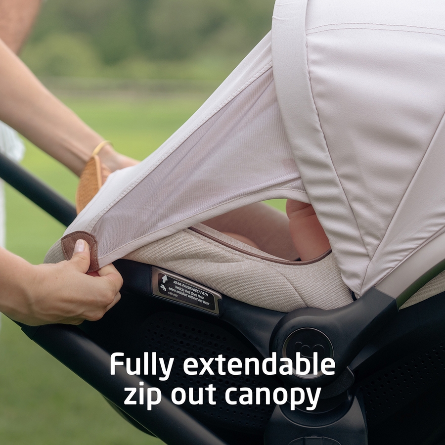 Our new canopy design zips out to extend, providing full-coverage sun protection and privacy for your little one. Easy-to-use magnets secure the canopy to the car seat, and they’re so quiet, you won’t wake baby when you decide you need full coverage.