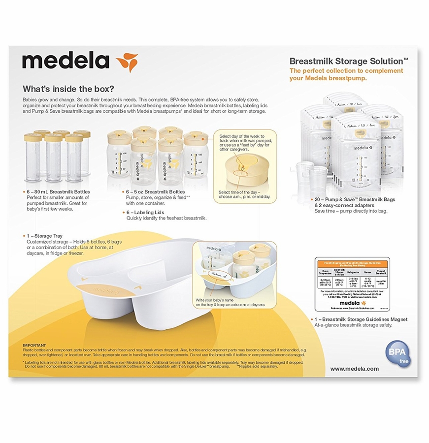 The Breast Milk Storage Solution? is the perfect complement to any Medela breast pump. The complete system allows you to safely store, organize, and protect your breast milk throughout your breastfeeding experience. Medela breast milk bottles, labeling lids, and Pump & Save? breast milk bags are compatible with all Medela breast pumps and ideal for short or long-term storage. The extra containers are also great to pump into for fast, easy breast milk storage.