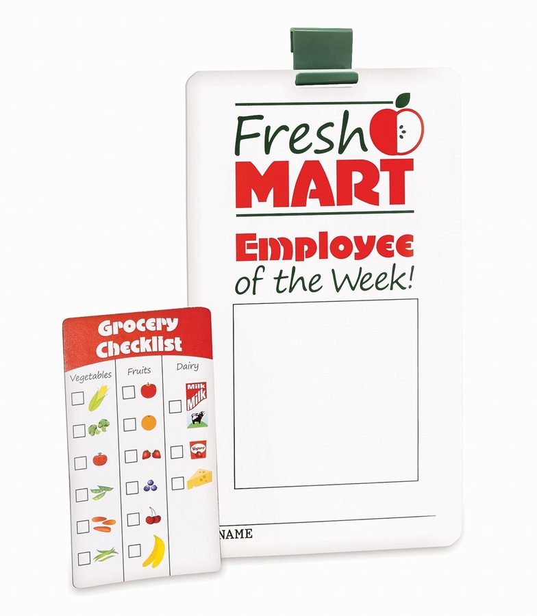 Role play items include apron, conveyor belt divider bar, shopping bag, play money, cards, coupons
