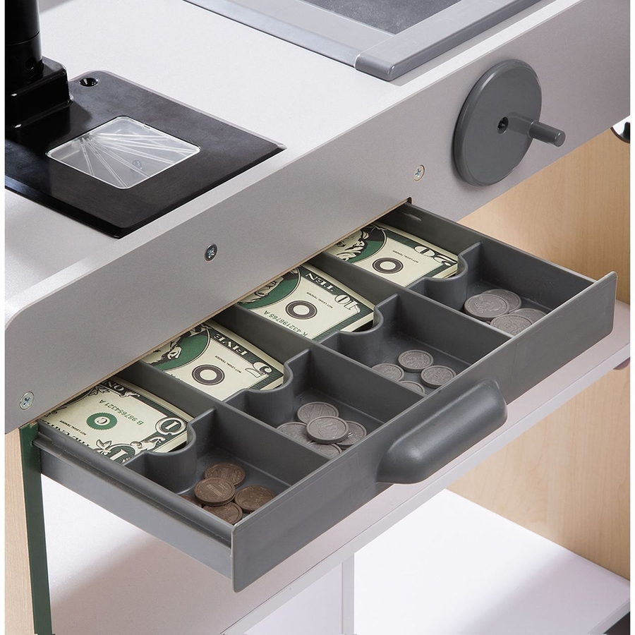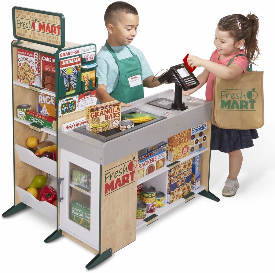 Shopping and playful purchasing is exciting at the sturdy wooden Fresh Mart Grocery Store! The free-standing play space with smooth, curved corners and edges lets customers three and older browse the shelves and pay for purchases on one side, and allows the grocer to ring up items on the other. Realistic features include beeping "scanner," a hand-crank conveyor belt, a card-swiping machine, a keypad/calculator, and cash drawer. Kids are sure to find everything on their shopping list at this friendly neighborhood grocery store!