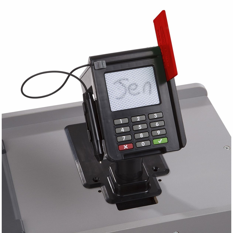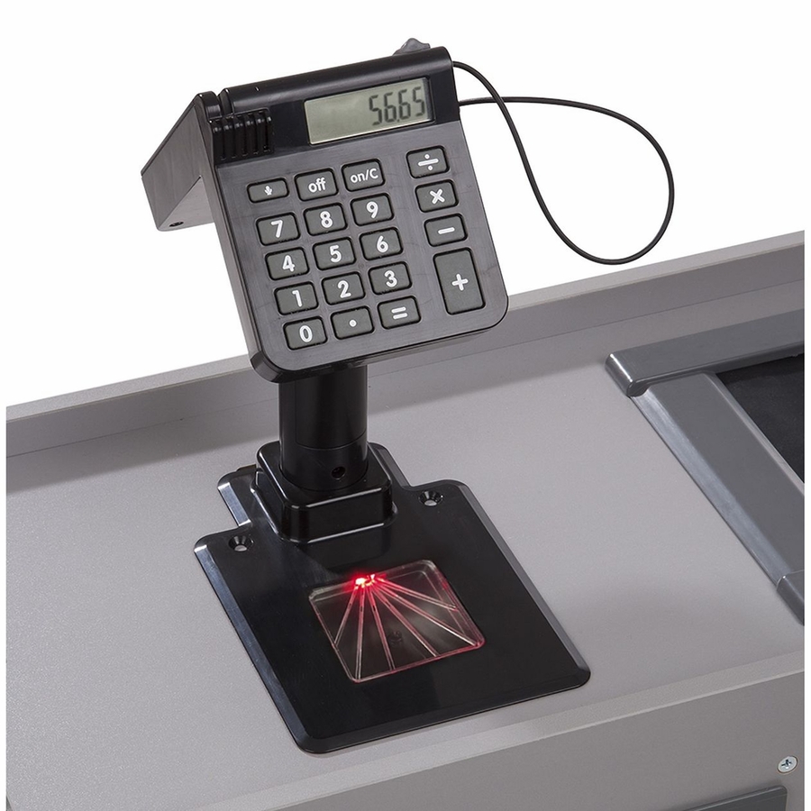 Includes hand-cranked conveyor belt, beeping "scanner," bagging area, card swipe machine, and cash drawer