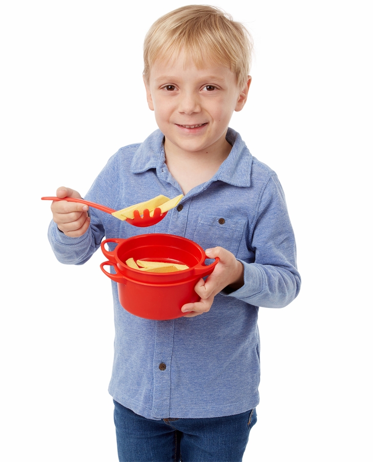 Prepare perfect pretend pasta every time with this 50-plus-piece pasta-making set! Fun pasta boxes hold felt penne, bow tie pasta, linguini, and ravioli pockets that can be hand-stuffed with felt spinach, meat, or cheese fillings. Follow the illustrated guide to order and "cook" the pasta in the large cook pot with lid, and "strain" it in the colander over the cooktop and sink play mat. Use the pasta spoon to scoop into the included pasta bowl, top with tomato sauce, cheese, or, butter toppings, and dig in! The set also includes a sauce jar, cheese shaker, salt shaker, and fork. This inventive set lets kids create countless imaginative pasta meals from start to finish!