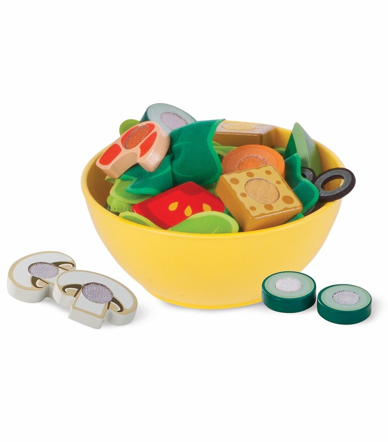 Make sensational pretend play salads fresh to order! The all-inclusive 52-piece set includes felt salad greens (kale, lettuce, and spinach) in hinged containers, and slice-able wooden vegetables (carrots, tomatoes, cucumbers, mushrooms, and green peppers), proteins (shrimp and grilled chicken), and toppings (olives and croutons). For the finishing touch, two salad dressing bottles "squirt" string! Place an order on the reusable menu card, slice ingredients with a wooden knife on the cutting board, toss with wooden salad utensils in the bowl, and then enjoy a fresh salad using the fork with self-stick tabs. Kids and parents alike will love this healthy way to play!