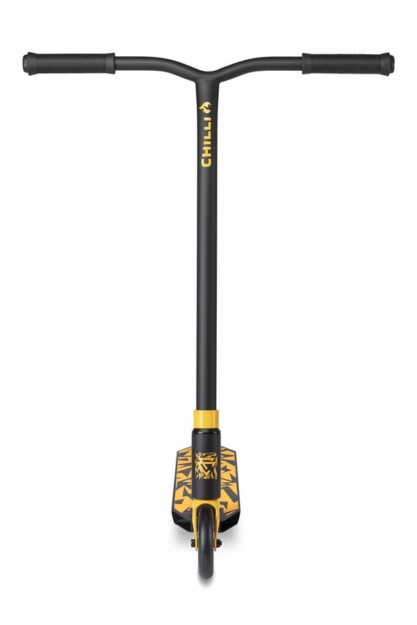 The Chilli Pro Scooters + Corey Funk collaboration scooter is here! Designed by former pro rider and YouTube sensation Corey Funk of the Funk Bros, this new Chilli Pro Scooter is perfect for entry-level riders of all ages and is built with the best materials at an unbeatable price. The boxy 19.7” by 4.5” aluminum deck is perfect for easy grinding and finger whips. The 2-bolt aluminum clamp uses an hidden internal compression (HIC) system and the 110mm polyurethane on aluminum wheels feature integrated bearings that were designed to endure greater impact.