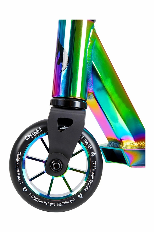 Based on the BASE model, the Neochrome is the new Chilli Pro scooter model for every beginner. German engineered Chilli quality at an amazing price - the Rocky Neochrome is unbeatable in ability and looks. You get to ride the skatepark with confidence on this cool ride! The deck is 6061 aluminum, 50cm (~19.7") long and 11.5cm (~4.5") wide with 3 degrees of concave for optimum control. This gives you space to move around the deck while maintaining a firm footing. The slim cut carbon steel fork will take the impact as you advance as well completes the classic design of the scooter. For compression, we use a universal HIC and 2 bolt aluminum clamp with a semi sealed loose ball bearing headset to save weight. Color coordinated hand grips and PU 110mm (~4.3") 6061 aluminum cored wheels complete the look. The flex brake is made of magnesium steel mounted from above.