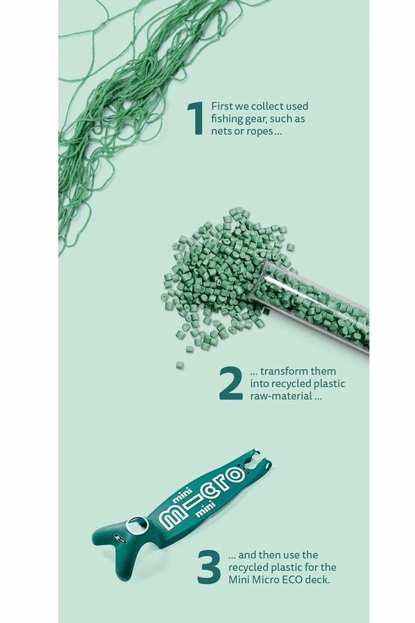 The Micro Mini Deluxe, for ages 2-5, is now green - in more than one sense! As Micro focuses on sustainability and corporate responsibility, we've developed the ECO-Collection, featuring scooters created with recycled materials - specifically from the maritime industry. The 'green plastic' used for the production of the ECO-Collection (specifically in the scooter deck and brake!) is from discarded and obsolete fishing gear, ropes, trawls, etc that would've normally been dropped into the sea. Our global headquarters, based in Switzerland, discovered that using recycled “green plastic” from fishing nets not only affects the health of oceans and marine life, it also reduces the company’s ecological footprint during manufacturing by up to 82% compared to using non-recycled materials. In an effort to reduce our own waste for the Eco-Collection, we have minimized packaging where possible, using FS-certified paper, and used packaging created from degradable material.