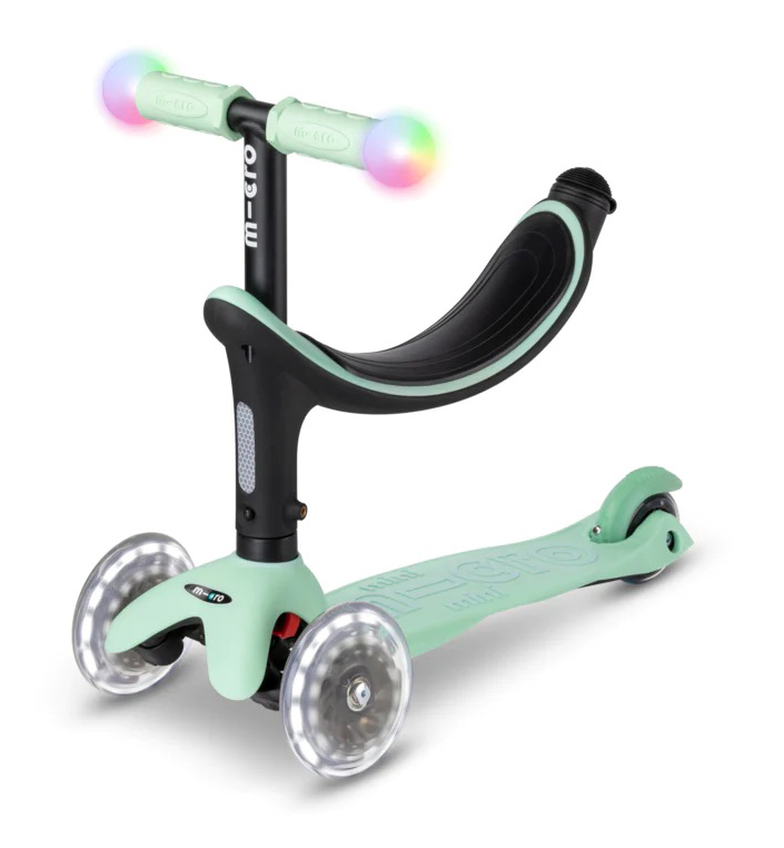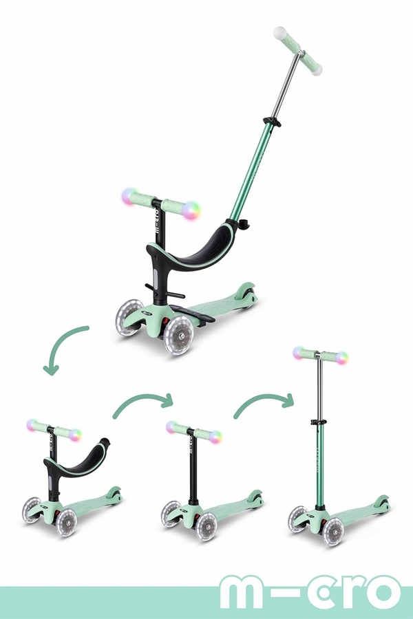 The innovative and ergonomic all-in-one scooter can be used in four different variations: at the very beginning with seat, two footrest options, and push bar for the parents; later on without the parent’s push bar, as a mix between balance bike & scooter; as a starter scooter for young riders; and finally as a classic Micro Mini Deluxe Scooter with Magic LED light bulbs on the adjustable handlebar, plus LED wheels.