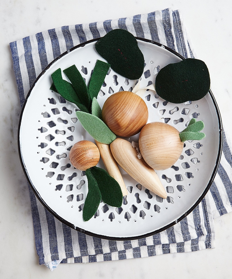 Made from solid hickory, maple, and cherry woods, these beautiful vegetables are turned and finished by artisans in Ohio. Topped with non-toxic clear finishes.The leaves are made from 100% wool from felt manufacturers in Pennsylvania, and the stems are natural cotton.