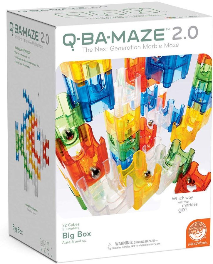 Q-BA-MAZE 2.0 is a unique system of colorful cubes that interlock to form a marble run. What makes Q-BA-MAZE special you ask? You can create thrilling maze sculptures in the form of animals, geometric shapes or any other design! The Q-BA-MAZE 2.0 Big Box includes 72 cubes in five different colors and 20 marbles. Configurations provide exceptional stability, allowing for unpredictable action when the steel balls travel the various routes. Use your critical thinking skills to stack and interlock the translucent pieces in a way that creates an advanced marble maze that keeps everyone, including yourself, guessing! Building the colorful maze is only half of the fun; grab your friends for a marble race-off! Expand your hand-eye coordination and spatial reasoning skills with every roll, twist and turn!