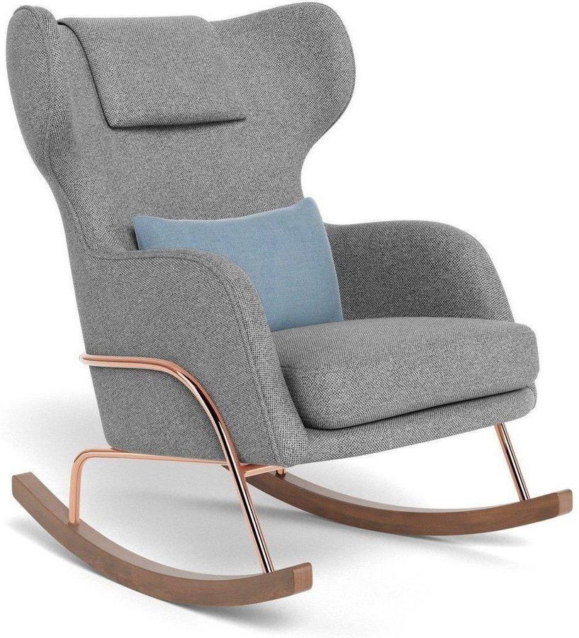 Monte Design Grand Jackson Rocker - Rose Gold Copper / Performance Weave Pepper Grey Fabric / Brushed Cotton-Linen Sky Pillow