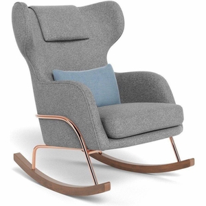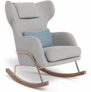 Monte Design Grand Jackson Rocker - Rose Gold Copper / Performance Weave Cloud Grey Fabric / Brushed Cotton-Linen Sky Pillow