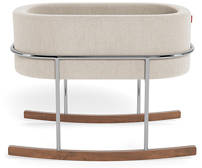 Our Rockwell bassinet is synonymous with ultimate modern luxury; it is the perfect combination of beautiful materials and a soothing rock for your little one. Its streamlined chrome stand with solid walnut rocking feet is beautifully contrasted to the soft upholstered basket that can be removed and transported to different rooms in your home (or the Grandparents' home!). When you are finished with the bassinet, the basket alone makes an excellent spot to store all your baby's new stuffies!