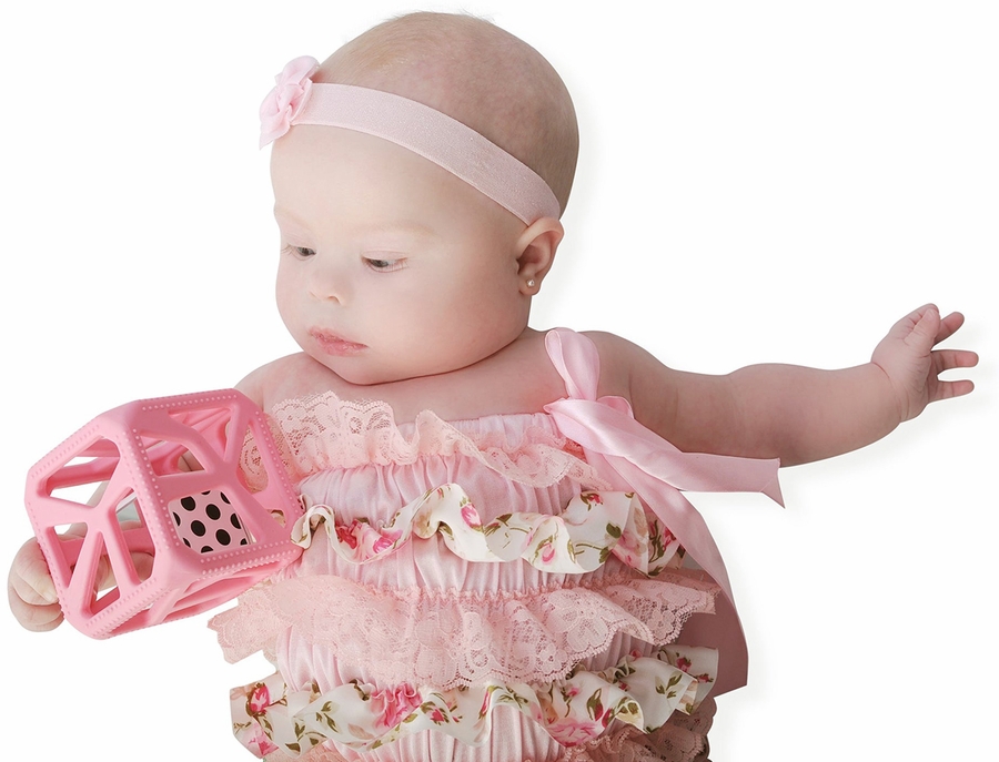 The Malarkey Kids Chew Cube is the mom-created modern rattle and teether. It provides four-way sensory stimulation, including soft, textured teething edges for tender gums; large flexible holes to help baby with gripping skills plus a black and white patterned rattle with mirrors to provide stimulation for baby's ears and eyes.