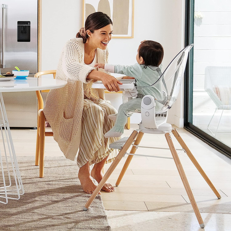 Your little one is about to dine on cloud 9! The sleek 360° Cloud™ Swivel High Chair elevates mealtime with function and style. Easy to clean, easy to assemble, and easy on the eyes, this stylish high chair is also easy to love thanks to its superior safety features. A five-point harness system keeps baby secure while the unique swiveling design moves with you and makes feeding solids a breeze. From the clear ergonomic seat and removable cushion to the chic wooden legs and dishwasher-safe tray, the 360° Cloud™ is a breath of fresh air when it comes to baby gear. And with its modern, neutral aesthetic, it’s the rare kind of baby equipment that blends seamlessly with your decor. Talk about drool-worthy (in more ways than one!).