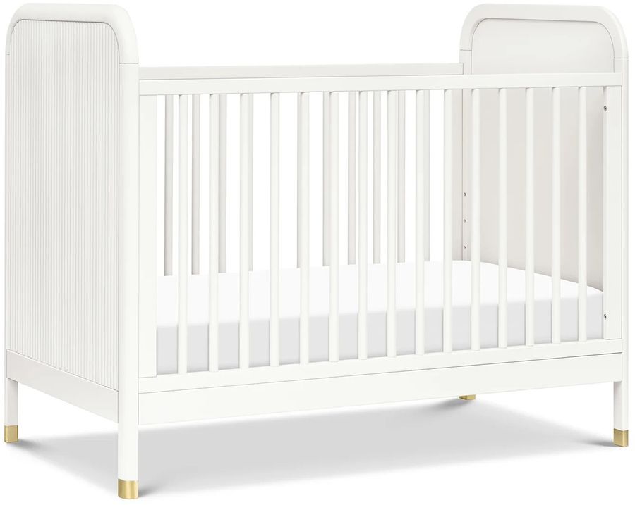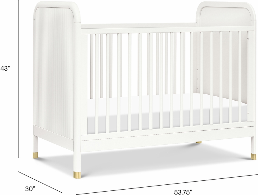 The Brimsley Tambour Crib is a masterpiece of craftsmanship that blends timeless design with modern functionality. Its distinctive tambour design and gently curved slats, paired with elegant gold feet, make this crib more than just a place for your little one to rest; it's a statement piece that elevates the aesthetic of your nursery._