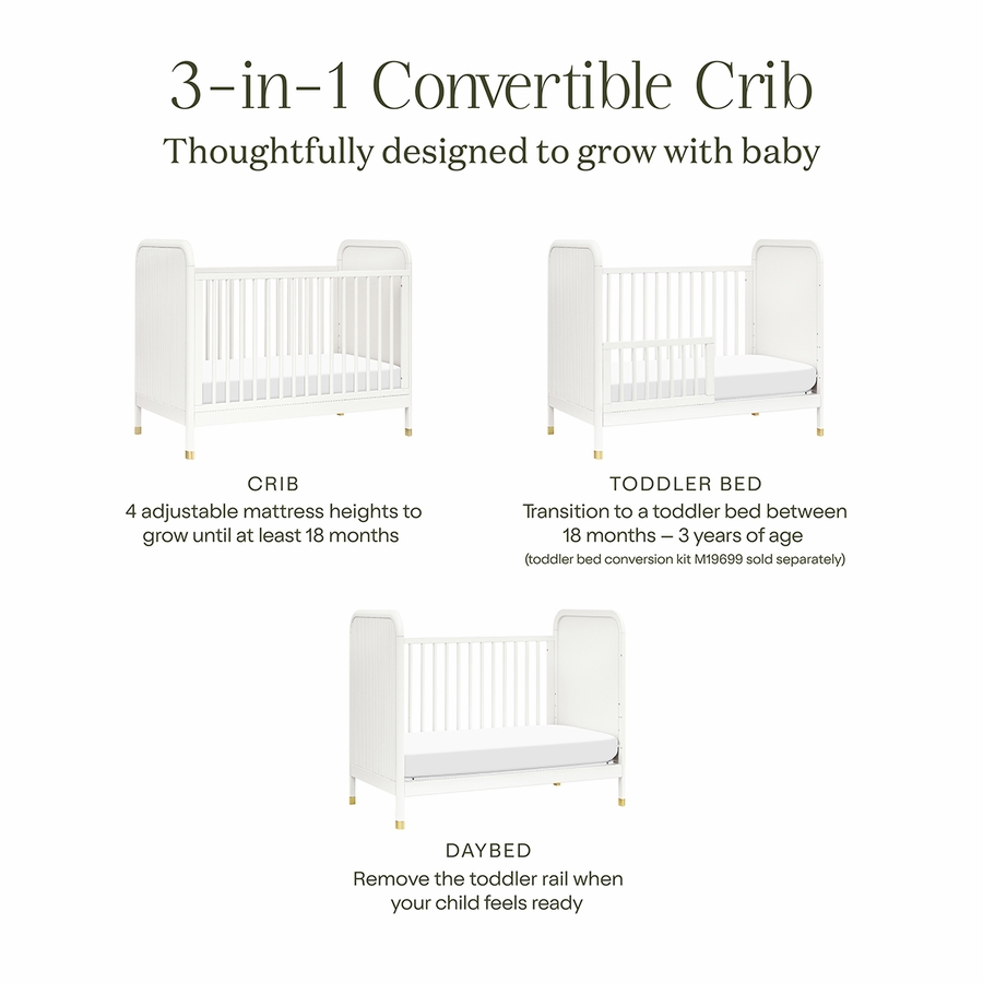 - 3-in-1 CONVERTIBILITY: Our cribs adapt as your baby takes their first steps into toddlerhood. Designed to easily convert to a toddler bed and daybed. (toddler bed conversion kit #M19699 sold separately)