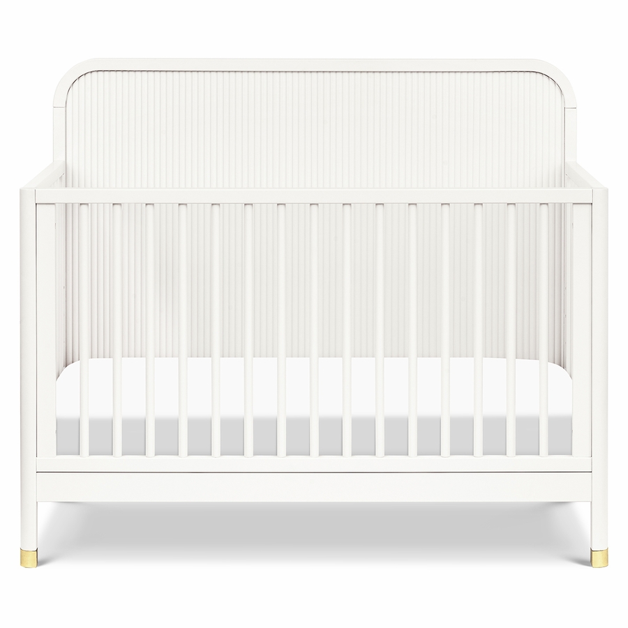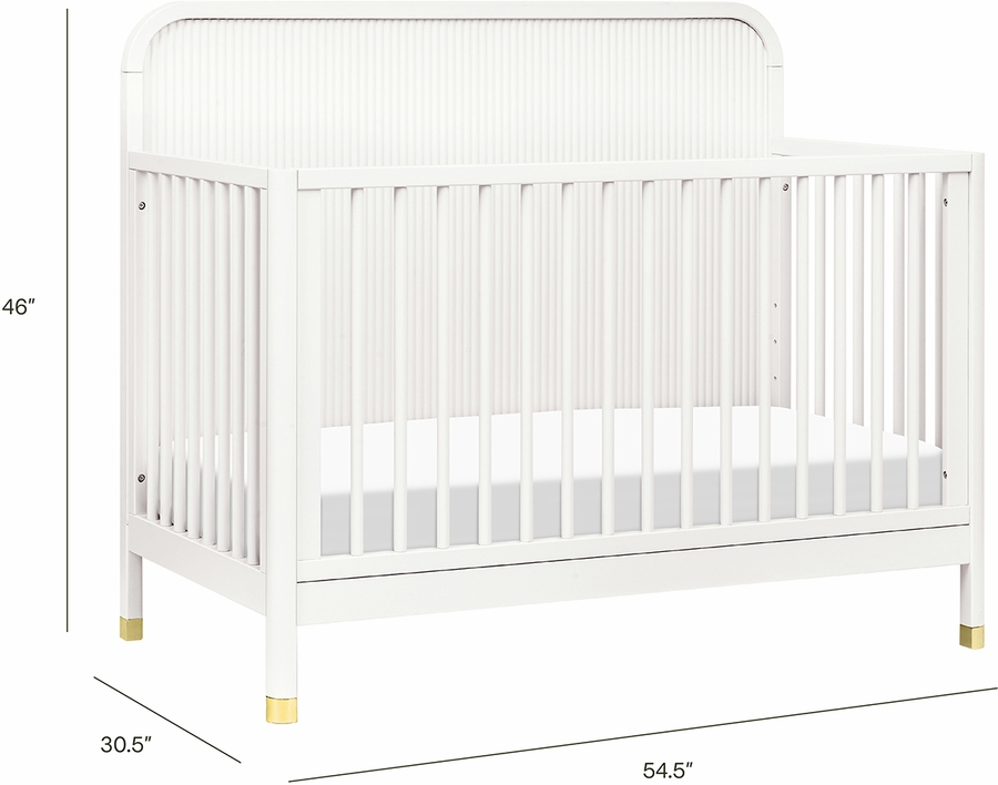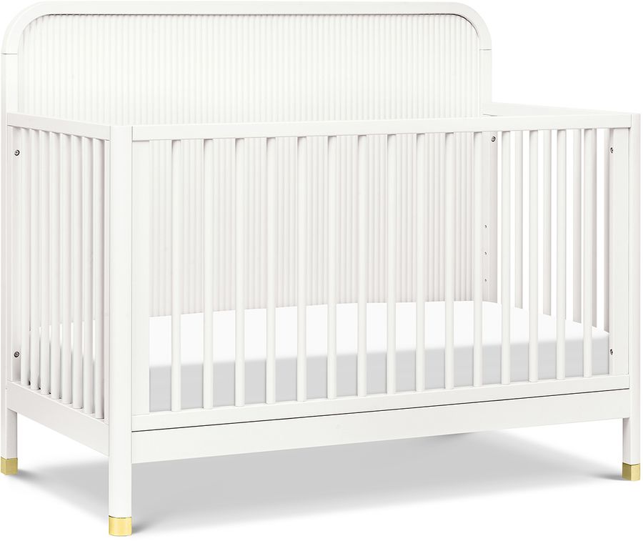 The Brimsley Tambour Crib is a masterpiece of craftsmanship that blends timeless design with modern functionality. Its distinctive tambour design and gently curved slats, paired with elegant gold feet, make this crib more than just a place for your little one to rest; it's a