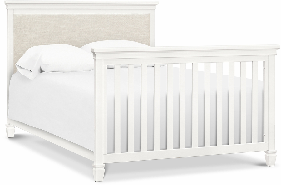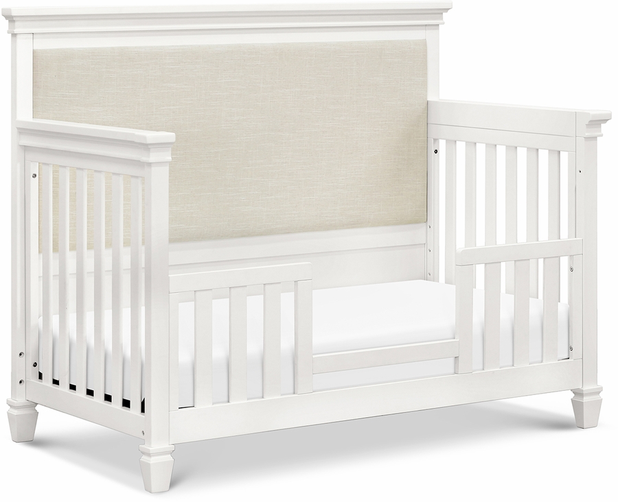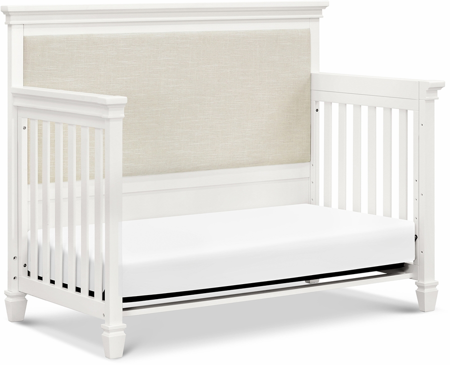 The Darlington 4-in-1 Crib brings the sophistication of relaxed French country style into the nursery. The Darlington balances delicate lines, gently detail molded tapered feet, and a lush upholstered back panel. Crib converts to a toddler bed, daybed, and full-size bed. Available in a Warm White finish.