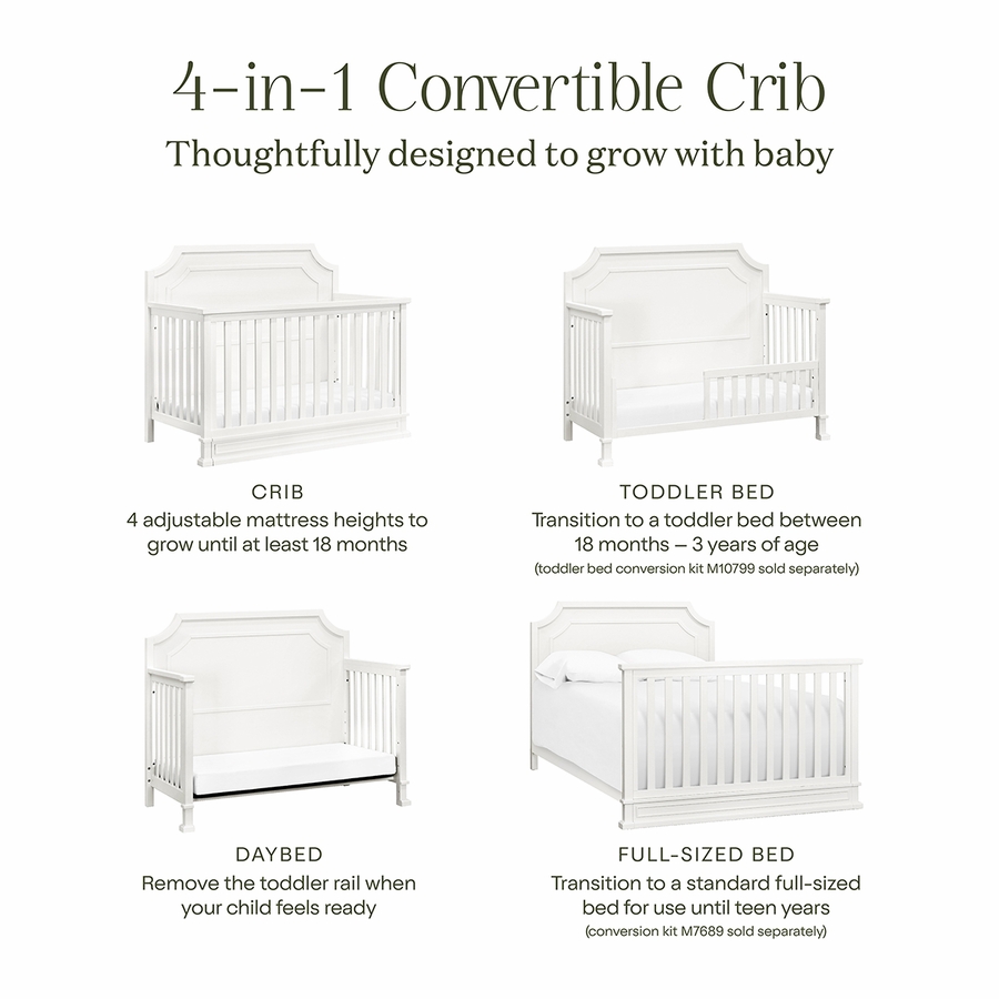 - 4-in-1 CONVERTIBILITY: Our cribs adapt as your baby grows, even in to their teen years. Designed to easily convert to a toddler bed, daybed, and full-sized bed. (toddler bed conversion kit #M10799 and full-size bed conversion kit #M7689 sold separately)
