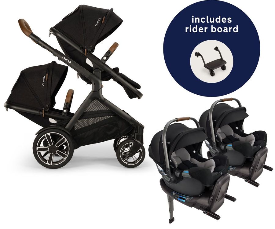 Nuna DEMI Next Twin Double Stroller with Rider Board + PIPA RX Travel System Bundle - Caviar