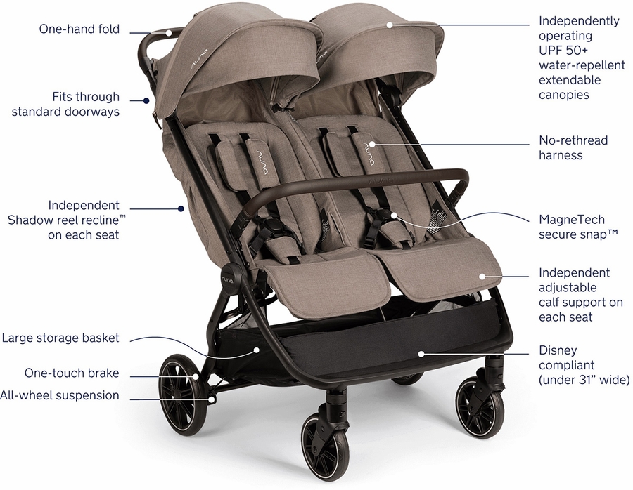 • Seats and canopies are completely independent of one another for customized strolls for two